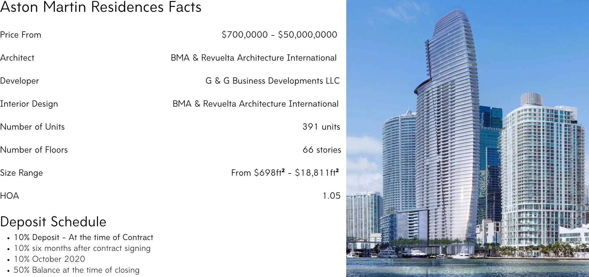 Aston Martin Residences will offer breathtaking views of the Miami River, Biscayne Bay, and Brickell skyline. Additionally, Aston Martin Residences will be within walking distance of Whole Foods, Brickell City Centre, and Mary Brickell Village. Aston Martin’s design team will design the building’s interior common spaces including the two private lobbies, the two-level fitness center with ocean views and full-service spa among other shared spaces within the development.